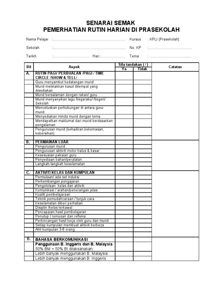 Senarai semak bagi transit prasekolah impian nurani skkn facebook contoh senarai semak prasekolah. Senarai semak pemerhatian pengajaran sehari prasekolah.
